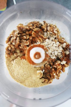 - Place the chickpeas, ground flaxseed, walnuts, oats, soy sauce, garlic cloves, oil, smoked paprika, herbs, coriander, black pepper and salt into a food processor/blender and whizz up until a sausage-like texture. This will take around 3-5 minutes.